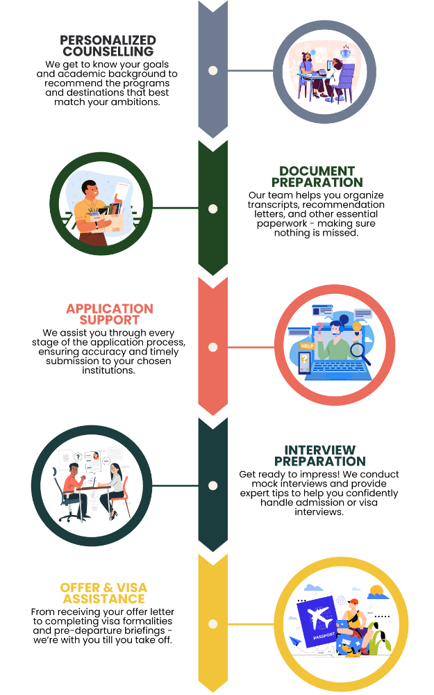 We assist you through every stage of the application process, ensuring accuracy and timely submission to your chosen institutions.